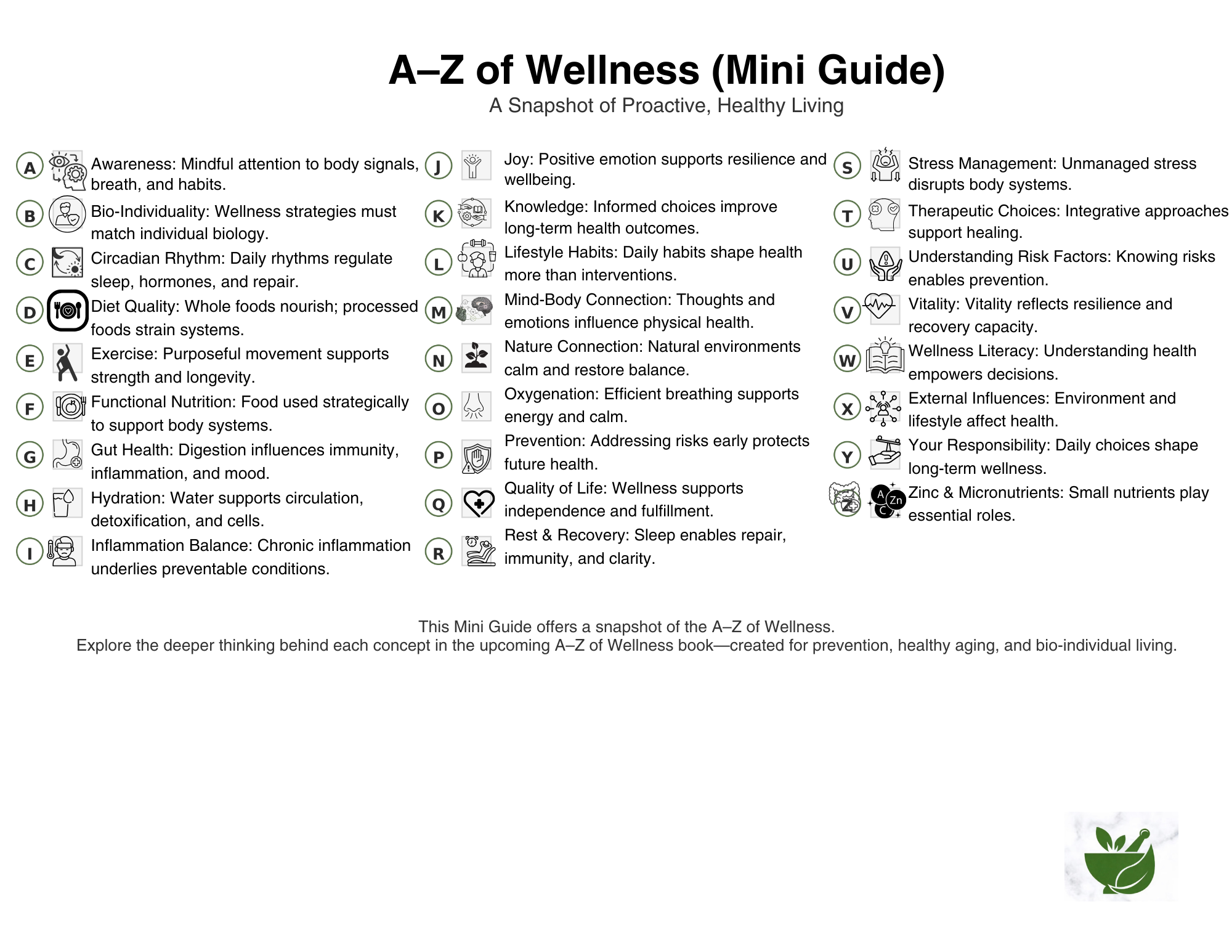 The Mini A-Z is not a program or a prescription. It is a visul and conceptual framework intended to stimulate wellnes thinking. by presenting core wellness ideas alphabetically, the guide encourages reflection and supports a proactive approach to wellness.